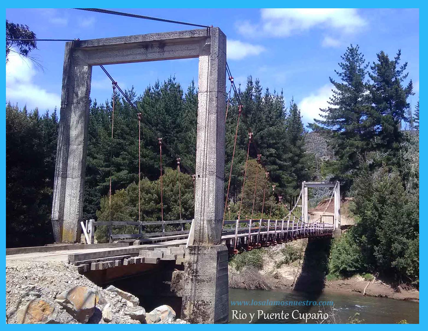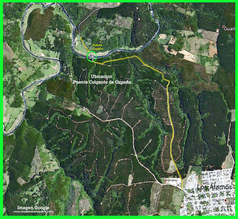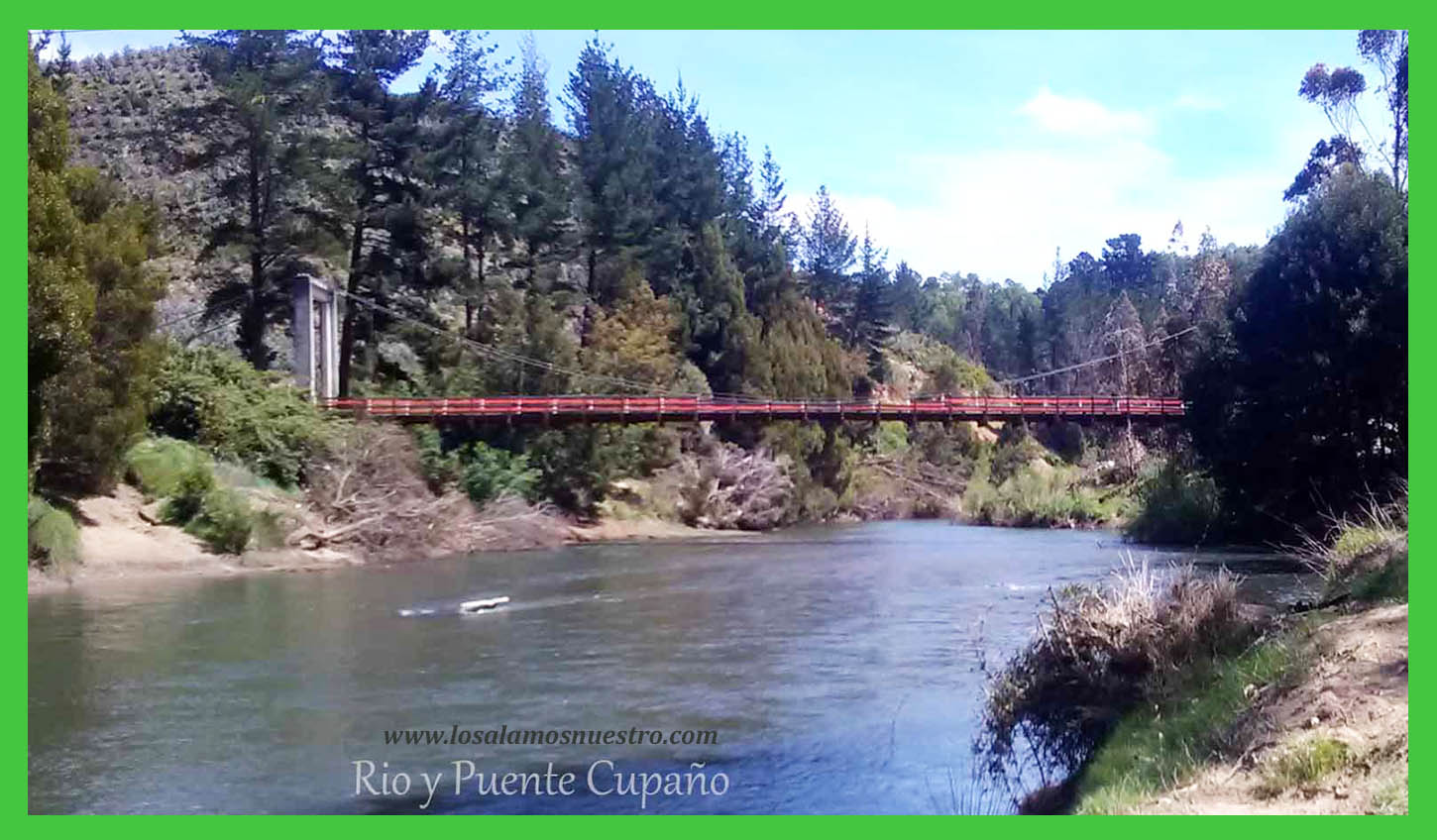 Nos remontamos al mes de agosto de 1948, diario La Patria de Concepción en su edición dominical titulaba “En esta primavera se construirá un puente provisorio sobre el Cupaño”. Hace varios años que numerosos vecinos vienen solicitando al departamento de Obras Públicas la construcción de un puente carretero en el rio de Cupaño, sin que hasta la fecha sea una realidad la iniciación de esta obra. Su construcción es de suma necesidad e importancia; en primer lugar, en el periodo de invierno queda en completo aislamiento un sector poblado del lugar llamado Los Cambuchos, que por estar ubicado a menor distancia de Los Álamos que de Lebu, como así mismo mejor carretera, obligadamente los productores y comercio en general deben llegar a Los Álamos, pueblo que le impone mayores facilidades. En segundo lugar, el lecho del río Cupaño es pedregoso, y el actual vado medianamente ofrece ciertas facilidades en el corto periodo de verano, después de esta estación, las aguas suben enormemente, llevando una fuerte corriente que solo permite la movilización de peatones, para lo cual la Dirección de Obras Públicas dispone de un bote que no ofrece las seguridades del caso cuando el río está de crecida.