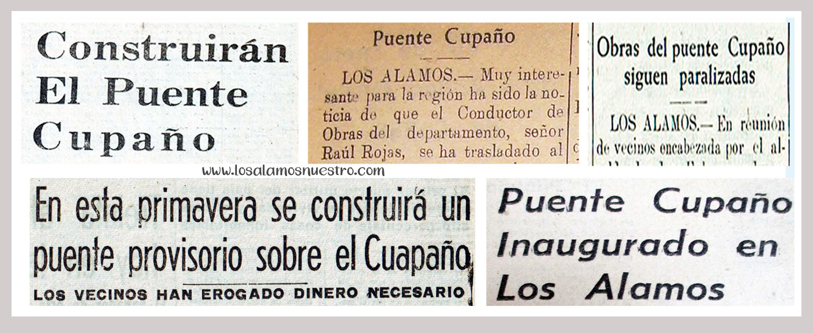 Finalmente, diario El Sur titulaba “Puente Cupaño Inaugurado en Los Álamos” (1974) obra que estuvo paralizada por más de veinte años.
