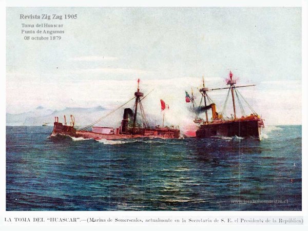 Chile había ocupado militarmente, en febrero de 1879, Antofagasta, para impedir el remate decretado por Bolivia de las salitreras confiscadas a la Compañía chilena de salitre de Antofagasta, vulnerando los tratados celebrados por Chile en 1866 y 1874. Hilaron Daza, presidente boliviano, con apoyo peruano, declaro la guerra a Chile. Perú fingió mediar amistosamente, pero Chile, en conocimiento de un tratado secreto, ofensivo de Perú y Bolivia, declaro la guerra a ambos el 5 de abril de 1879. Comenzó así la Guerra del Pacifico.